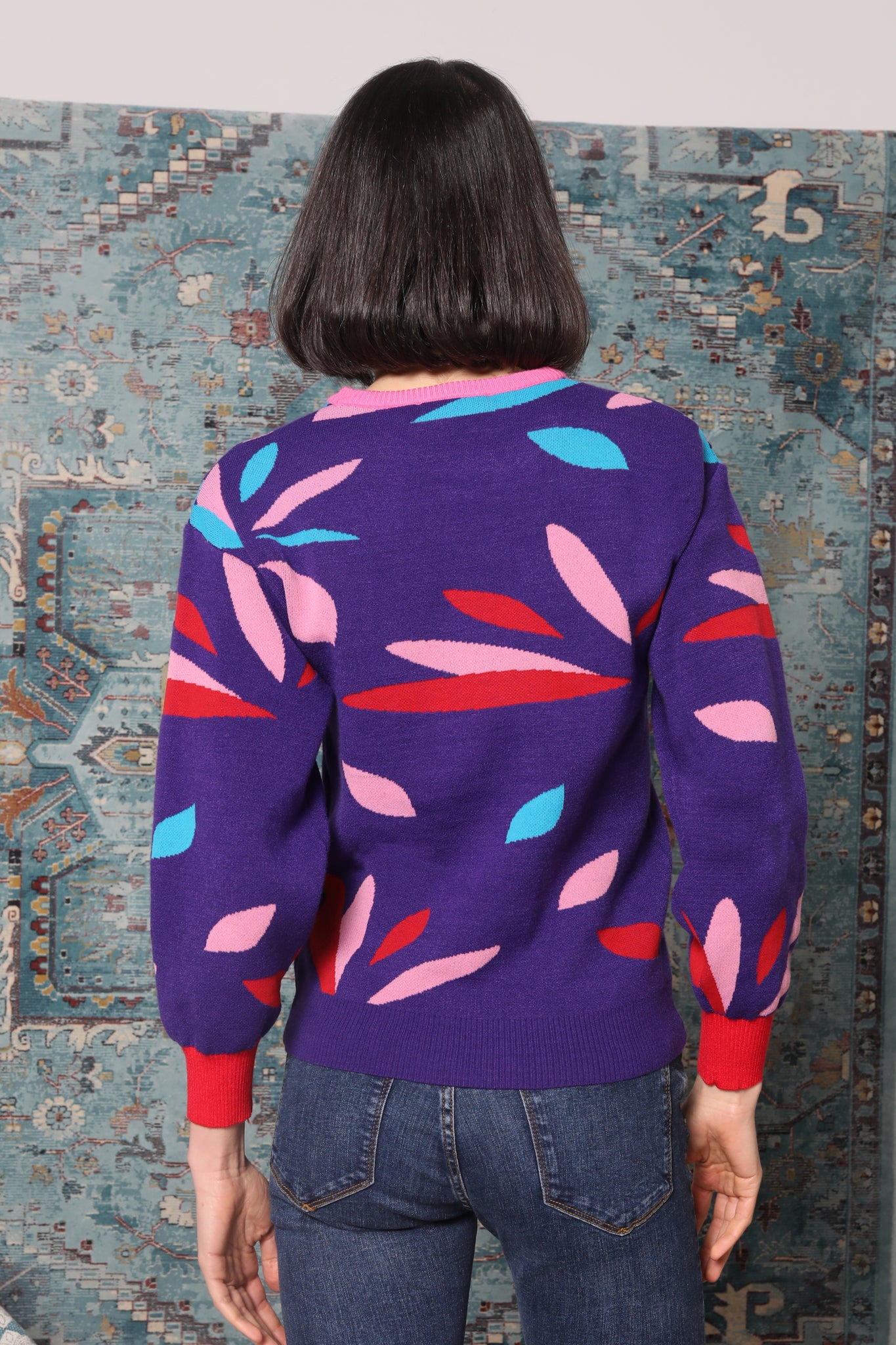 Jersey de punto morado presenta un hermoso motivo que se asemeja a hojas en colores rosa, rojo y azul. El contraste entre el color base morado y los tonos vivos de las hojas crea un aspecto llamativo y elegante. 52% Viscosa 27% Poliéster 21% Nylon.